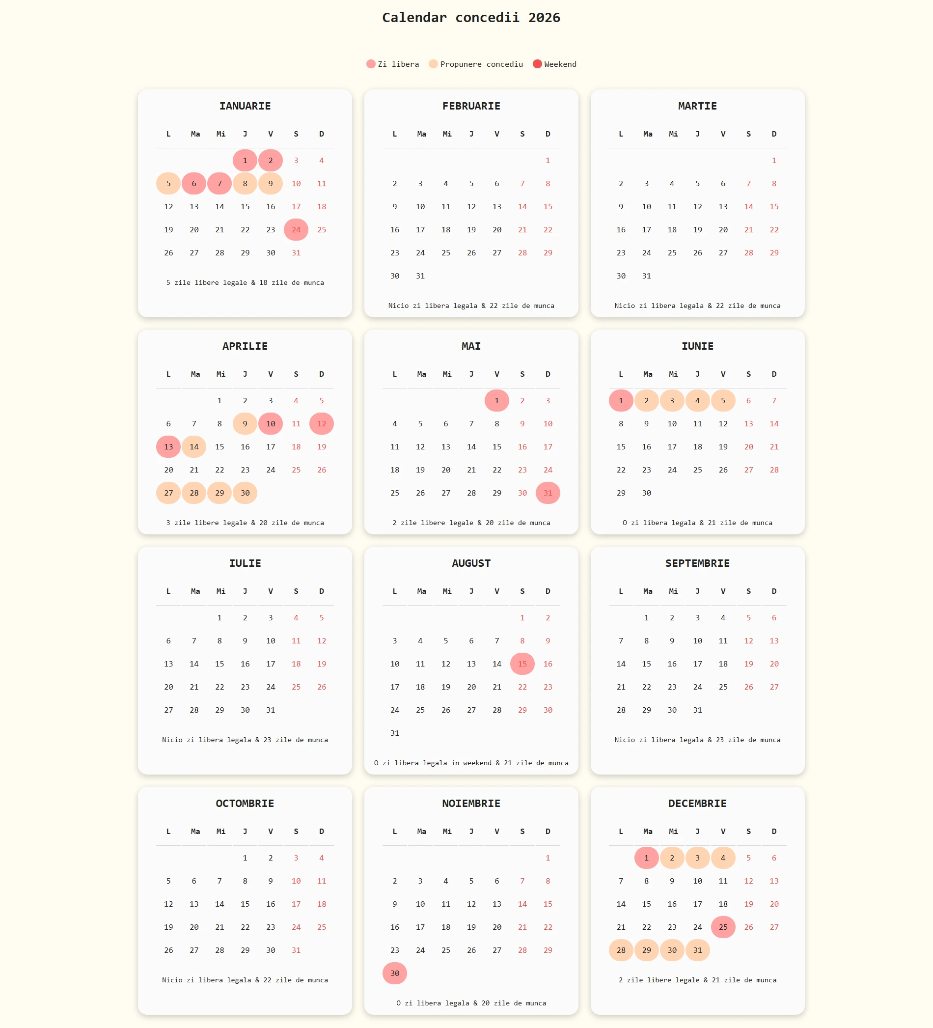 Dacă îți planifici concediul din timp, poți să profiți la maximum de zilele libere de anul viitor. Aruncă un ochi pe calendarul pentru 2026 și o să vezi cum poți să legi sărbătorile legale cu câteva zile de concediu, astfel încât să prinzi pauze de peste 10 zile legate — numai bune pentru o relaxare adevărată, timp cu familia sau o escapadă rapidă.